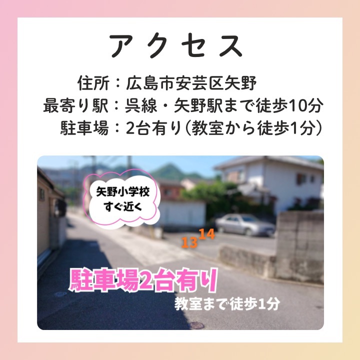 当教室は、矢野小学校から徒歩3分、JR矢野駅から徒歩10分の静かな住宅街で、1歳からシニアの方までのレッスンを行っています。