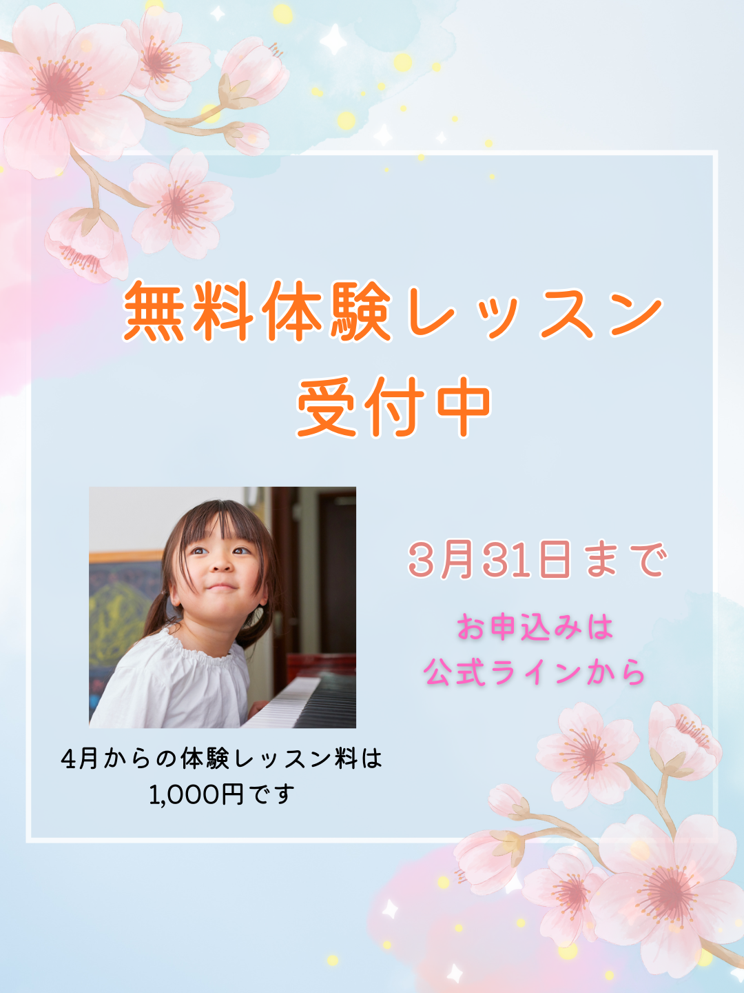 3月31日までのお申し込みで、通常1,000円の体験レッスンを無料で行います。